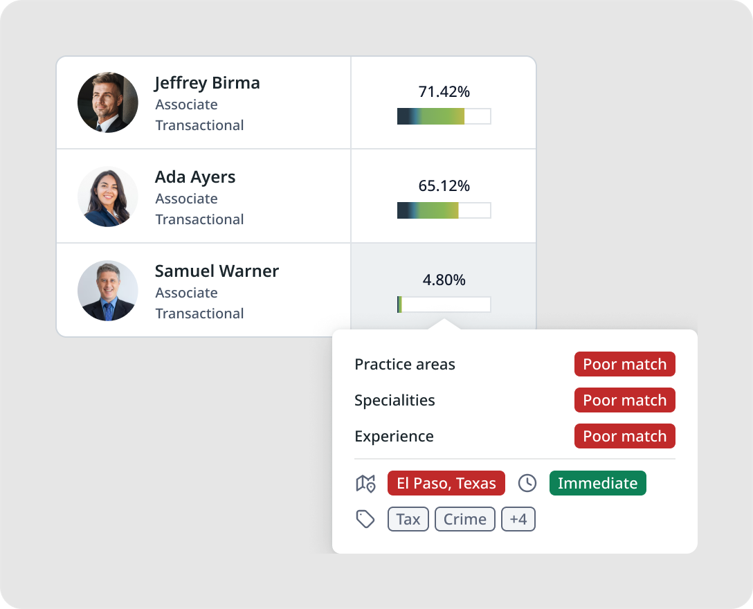 AI-Generated scored and ordered candidate lists based on your firm profile. | ||